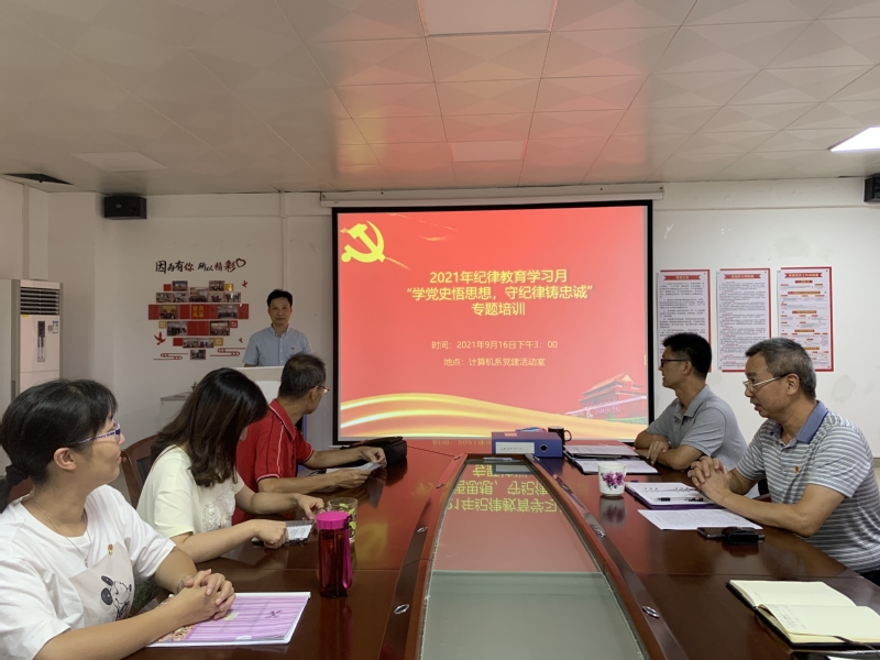 为深入学习贯彻习近平总书记在十九届中央纪委五次全会的重要讲话精神,进一步强化党员教师的纪律意识,打造一支有信仰、有担当的教师队伍。9月16日下午,计算机系党总支在系党建活动室举办“学党史悟思想,守纪律铸忠诚”专题培训。计算机系党总支全体党员同志参加培训。活动由党总支书记刘钦创主持。