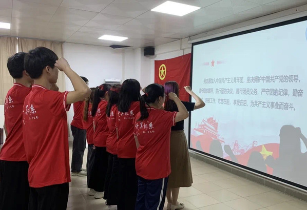 随后,团委书记朱梓谊带领全体团员重温入团誓词,面对鲜艳的团旗,全体团员右手握拳,手举过肩,以坚定而洪亮的声音进行庄严宣誓!