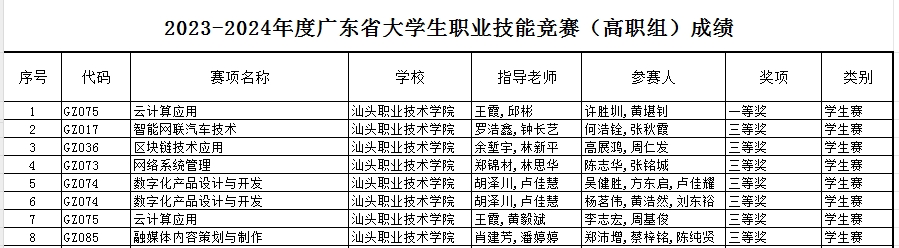 一直以来,电子信息学院坚持以赛促教,以赛促学,以赛促建。在2023-2024年度省级技能竞赛中获得1项一等奖(全校唯一)和7项三等奖。在2023-2024年度广东省大学生计算机作品设计大赛2项二等奖,2项三等奖。教师带学生参赛,取得良好成绩。