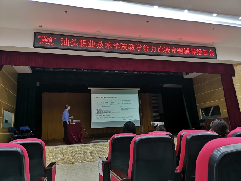 为更好地推动学院教学改革和教师专业成长,切实做好我院2020年参加全省职业院校技能大赛职业院校教学能力比赛参赛工作,提高我院教师参赛水平,根据《参加广东省2020年职业院校技能大赛教学能力比赛备赛工作方案》(汕职院教〔2019〕 73 号)安排,学院于10月24日下午在金园校区礼堂举办教学能力比赛专题辅导报告会。参会人员包括各学系及思想政治理论课教学部、心理与教育教学部所有45周岁以下(含45周岁)专任教师。本次专题辅导报告由李飞宇老师主讲。
