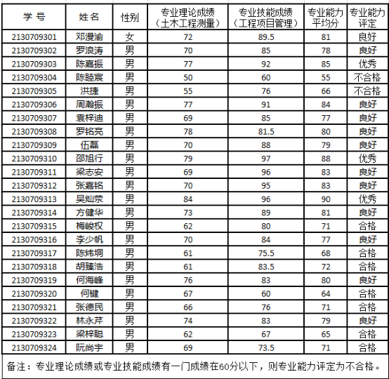 根据《广东省教育厅关于做好三二分段专升本应用型人才培养试点项目转段考核工作的通知》(粤教高函[2014]118号)精神,结合嘉应学院与我校联合制定的三二分段专升本应用型人才培养试点项目转段考核工作方案要求,对2021级建设工程管理“三二分段专升本协同育人项目实验班” 全体学生24人进行专业能力考核,现将考核结果公示如下: