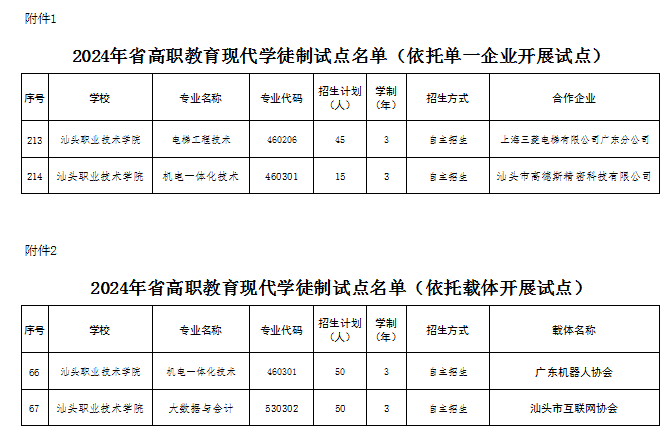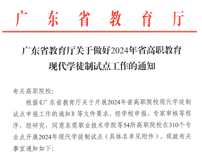 2024年3月25日,广东省教育厅发布《关于做好2024年省高职教育现代学徒制试点工作的通知》,同意我校电梯工程技术、机电一体化技术、大数据与会计3个专业开展2024年现代学徒制试点。