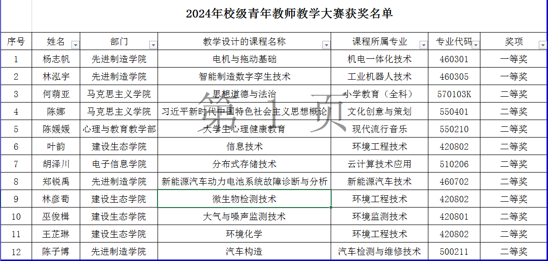 根据《关于举办2024年校级青年教师教学大赛的通知》(汕职院教〔2024〕70号)精神,经各教学单位推荐、校外专家评审,2024年校级青年教师教学大赛共评选出一等奖2名,二等奖10名。现予以公布。