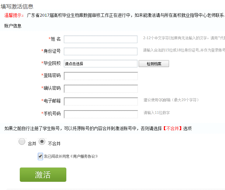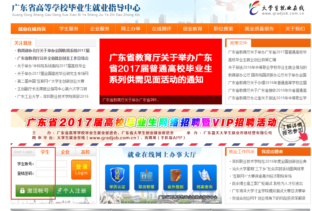1、激活账号(若毕业生账号已激活,可跳过此步)。打开大学生就业在线网站(www.gradjob.com.cn),在首页的左中位置找到“激活账号”按钮进入激活页面,在激活页面填写详细个人信息。激活账号后可在首页登录界面登录,账号为身份证号,密码为激活时设置的密码。