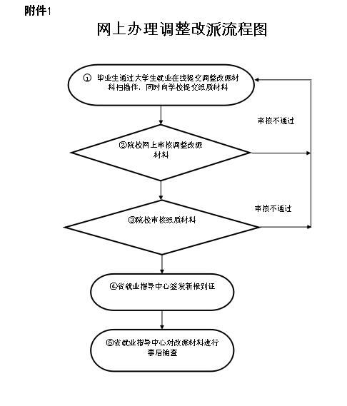 高校毕业生通过“大学生就业在线”网站(www.gradjob.com.cn)提交调整改派材料的扫描件并向学院提交调整改派纸质材料,由学院进行网上审核,学院审核材料无误后到省高校毕业生就业指导中心(以下简称省就业指导中心)统一办理(具体网上办理调整改派流程见附件1),办理完成后由学院就业指导中心通知毕业生回学院领取新报到证。