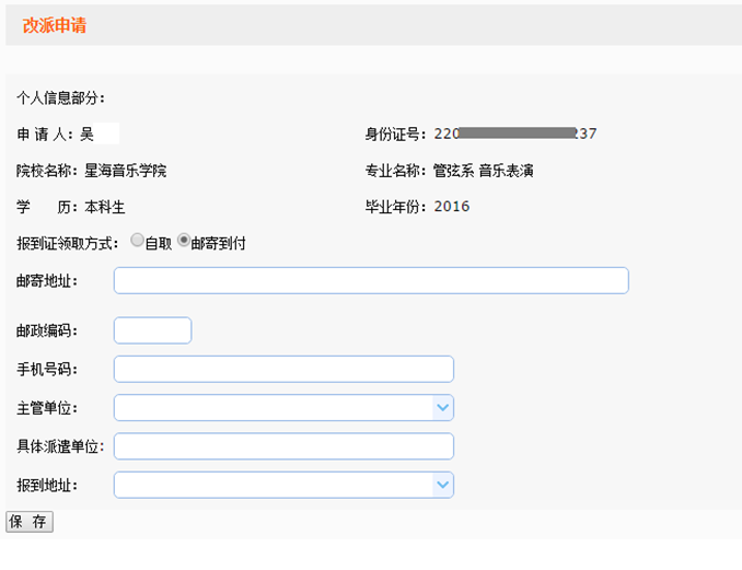 3、填写改派申请信息。“主管单位”填写新接收单位的就业主管部门(例如各省直、中直单位或各地级市人社局、教育局等),“具体派遣单位”填写具体就业单位,“报到地址”填写单位所在市(区、县)。主管单位和报到地址可输入部分关键字后模糊搜索后再选择,或点击下拉菜单选择。