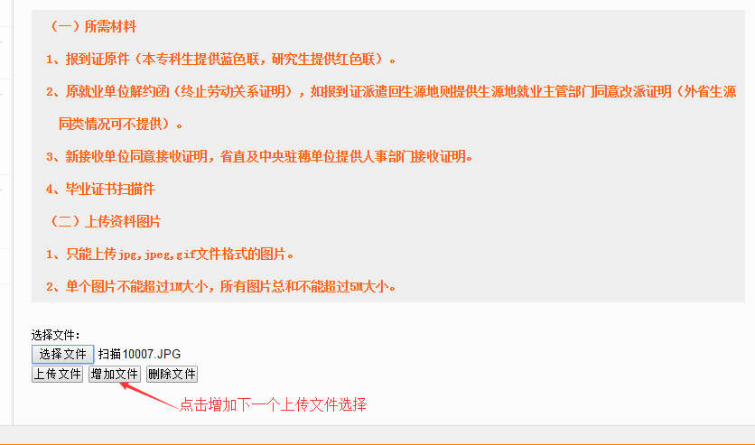 4、上传改派所需材料。点击“选择文件”后选择要上传的文件,点击“增加文件”后可以上传下一个文件,选择完所有要上传的文件后,点击“上传文件”。