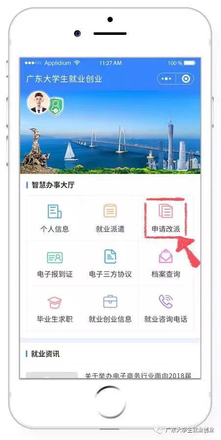1、登录“广东大学生就业创业”小程序,点击进入“申请改派”。