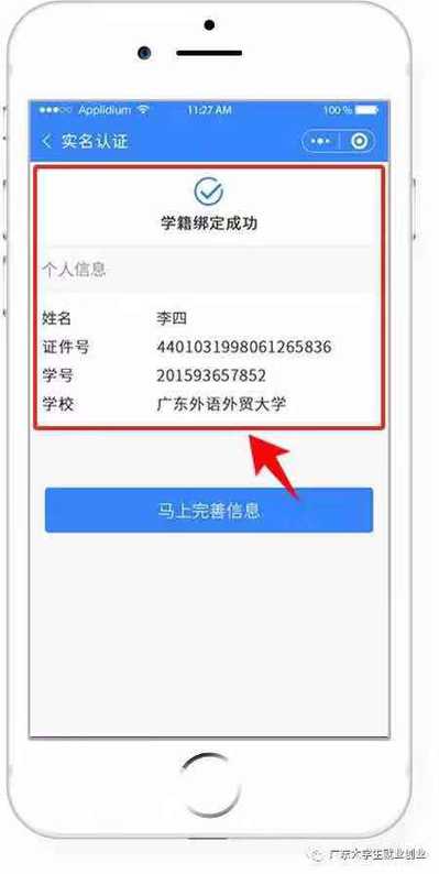 3、“刷脸”成功后,即可进行“学籍绑定”,点击“马上完善信息”可进入“生源上报”的操作。