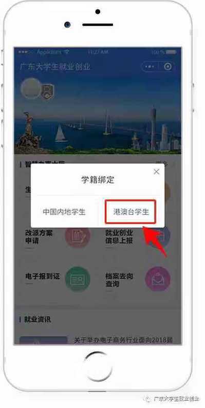 1、进入“广东大学生就业创业”小程序,在首页左上角找到“用户登录”,点击后出现两个弹窗“中国内地学生”“港澳台学生”,选择 “港澳台学生”。