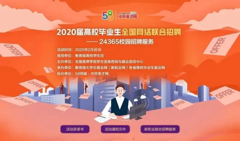 为贯彻落实习近平总书记在统筹推进新冠肺炎疫情防控和经济社会发展工作部署会议上的重要讲话及系列指示批示精神,认真落实国务院常务会关于鼓励吸纳高校毕业生就业的工作部署,2月28日,教育部启动“2020届高校毕业生全国网络联合招聘——24365校园招聘服务”活动,为高校毕业生提供每天24小时全年365天的网上校园招聘服务,毕业生可登陆活动平台(www.ncss.cn)及各有关网站专栏参加求职招聘。