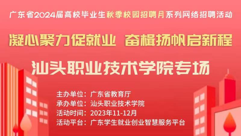 为深入学习贯彻党的二十大精神,落实党中央、国务院关于高校毕业生就业工作决策部署,按照教育部办公厅《关于开展2024届高校毕业生秋季校园招聘月系列活动的通知》要求,广东省教育厅会同全省高校,依托广东学生就业创业智慧服务平台(以下简称“平台”)开展主题为“凝心聚力促就业 奋楫扬帆启新程”的广东省2024届高校毕业生秋季校园招聘月系列网络招聘活动,诚邀广大用人单位参加本次招聘活动,活动具体安排如下: