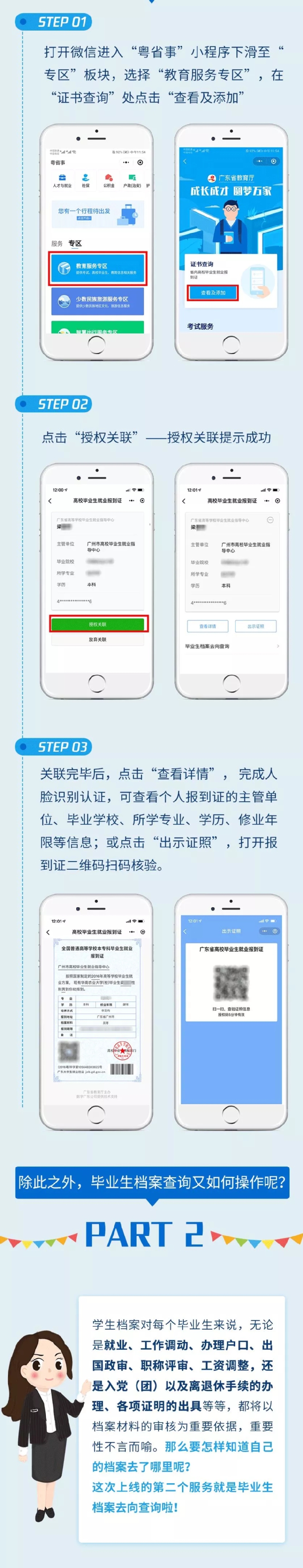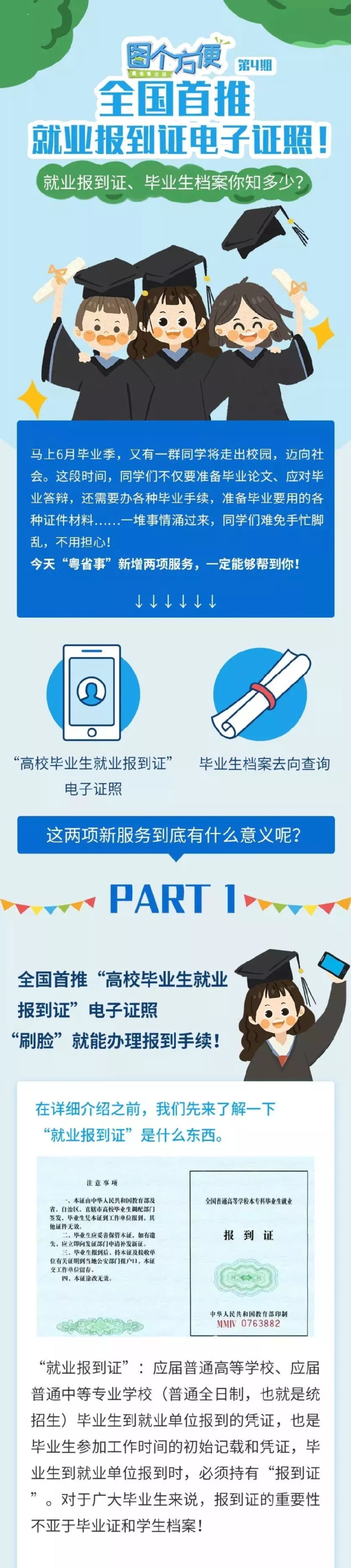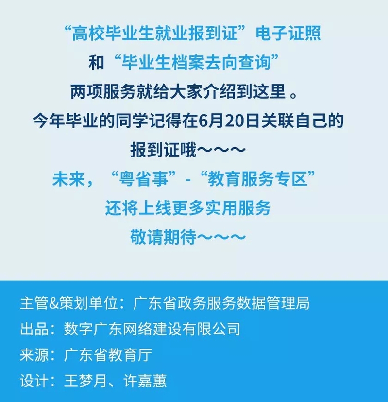 2019年5月28日,广东省高校毕业生就业创业智慧服务平台正式上线发布,电子报到证、档案去向查询、生源上报等业务可在网上一键办理。下半年还将上线电子三方协议、智慧招聘服务和可视化大数据功能。