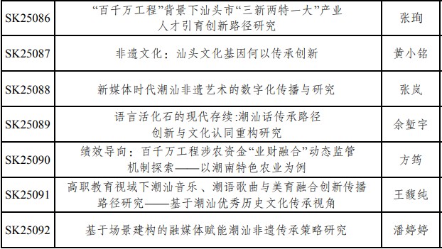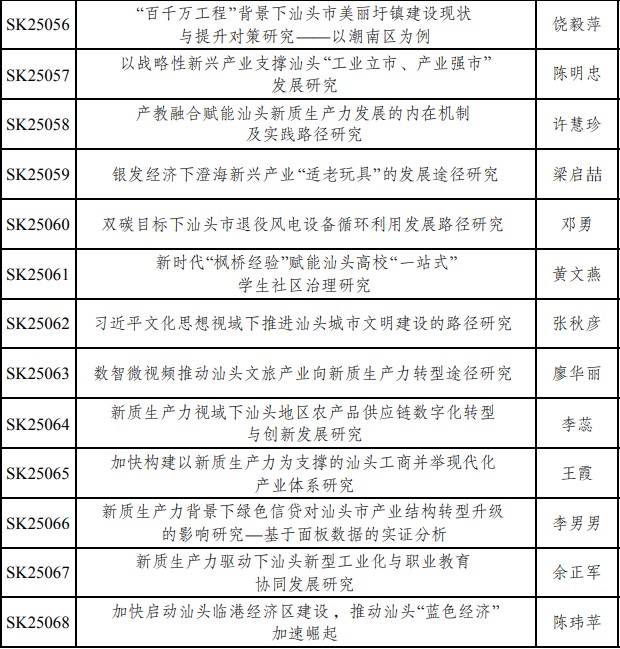 经汕头市社会科学界联合会批准,2025年度汕头市社科研究课题共有163项准予立项。我校教职工共立项47项,占立项总数的28.8%。接下来,科研设备处将认真组织各立项项目负责人按计划高质量完成课题研究工作,积极服务汕头地方经济社会发展。具体立项名单如下: