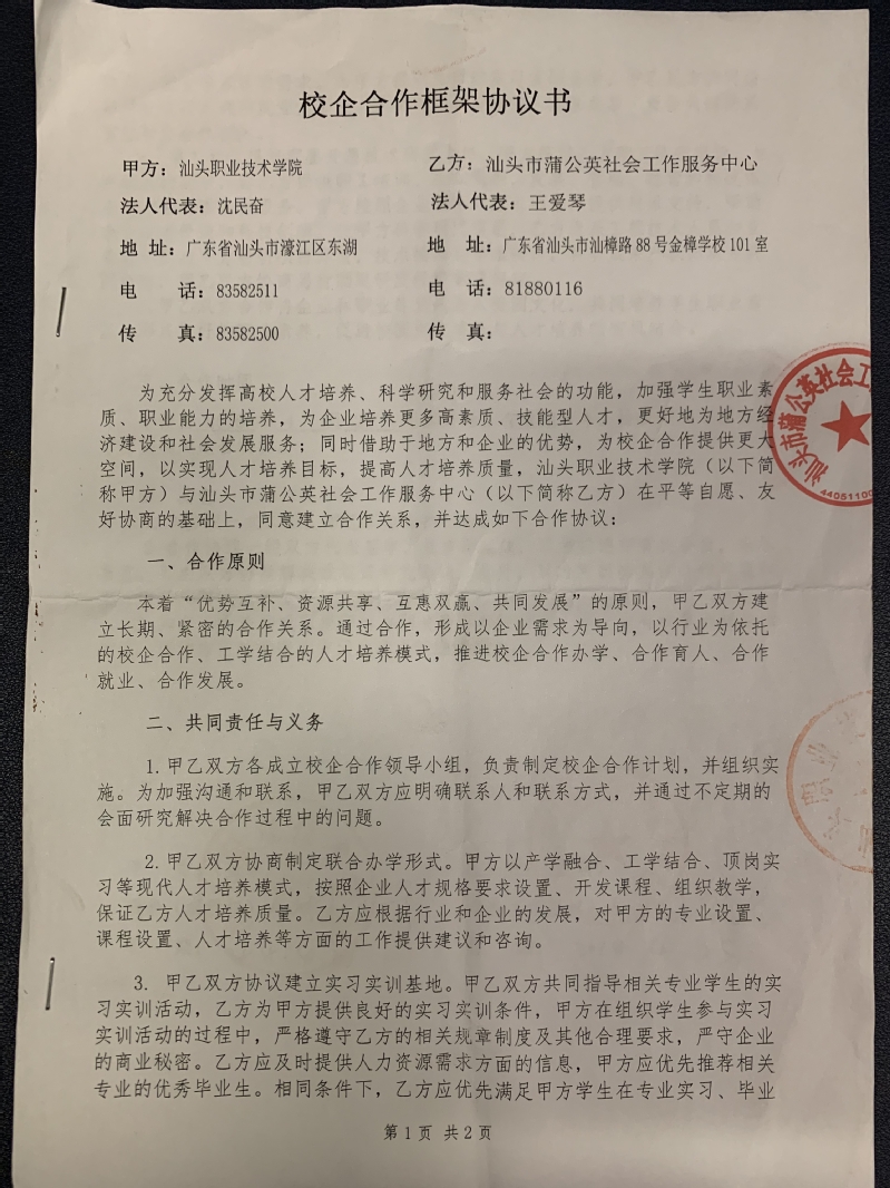 与汕头市蒲公英社会工作服务中心签订校企合作框架协议书