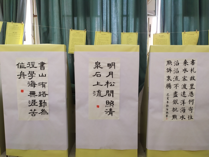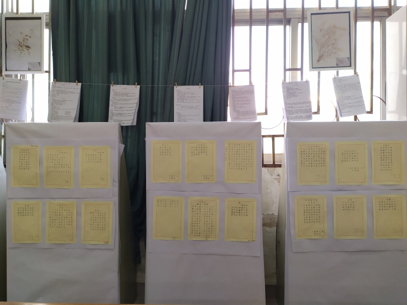 展览共设置四个版块,主要分为毛笔书法作品、硬笔书法作品、文学作品、教案设计。自此次活动启动开始,就得到语文教育专业同学们的热烈响应,共收到作品近200件,经评委们认真严格层层筛选,最终选出52件参展作品。19语文教育的新生在这次活动中大有“长江后浪推前浪”之势,勇夺毛笔书法和文学作品的第一名;17级的师姐们理所当然地在教学设计占绝对优势。同学们用遒劲的书法展示炽热的才情,通过挥洒文采表达内心的向往,而严谨的教案设计更是体现了扎实的基本功,无不吸引着过往的师生驻足欣赏,啧啧赞叹。