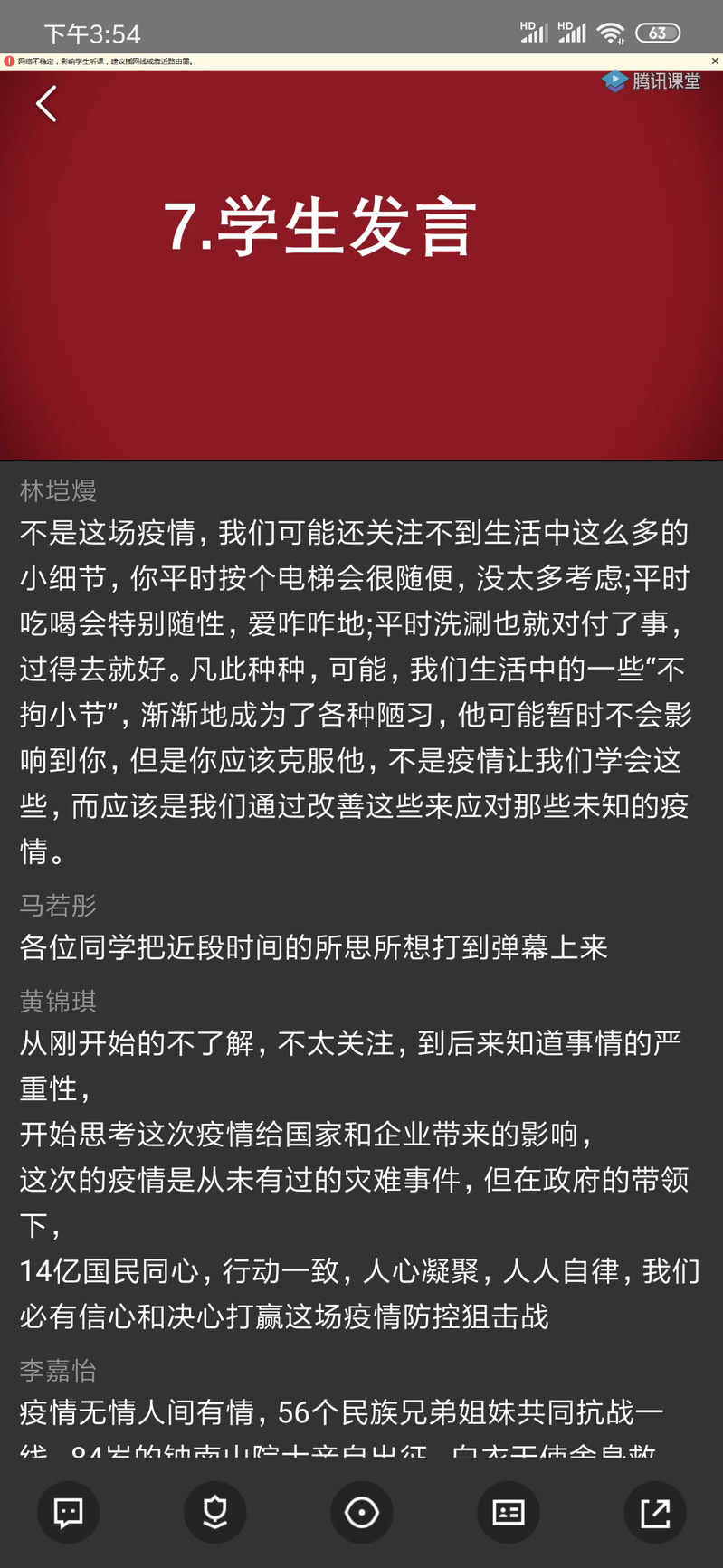 主题班会同学们通过视频积极参与其中。以屏幕代替黑板,通过此次网络主题班会,同学们更深入的了解疫情的现状、了解当代大学生的责任与使命。会后,同学们纷纷表示众志成城,抗击疫情。譬如:刘同学表达了期望祖国能够尽快战胜疫情,“逆行者”们能够平安归来的愿望。曾同学也表示会积极配合国家与学校的的工作,期待春暖花开,繁花与共。