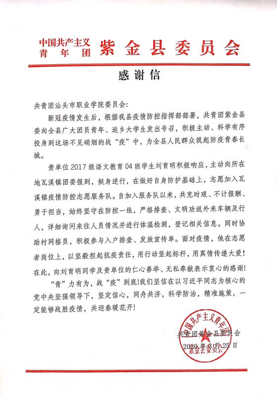 谈到这封来自县团委的感谢信,刘育明有些腼腆。他表示,自己只是做了点青年人力所能及的事情,作为汕职院的一名学生,他对学院的学习和志愿服务生活经历充满感恩,“一直以来,无论是在校参加公益活动,还是这一次疫情期间的临时任务,我都感到十分充实,这份充实也让我对以后的志愿服务工作充满向往”。