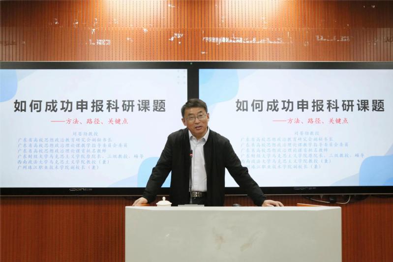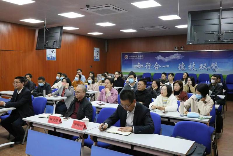 为深入学习贯彻党的二十大精神,进一步推动学校思政示范课堂和思政课教师创新团队建设,大力提升思想政治理论课教师教书育人能力,用实际行动落实立德树人根本任务,助力学校“双高”建设,学校于2023年3月3日上午,特邀广东省高校思想政治教育研究会副秘书长、广东省高校思政课教指委委员、广东省高校思政课首批名教师,广东财经大学教授、广州珠江职业技术学院副校长刘苍劲教授就“思政课教师创新团队建设”做专题讲座。专题讲座由学院党委副书记方小铁主持,马克思主义学院领导、全体思政课教师及各系辅导员代表出席参加。