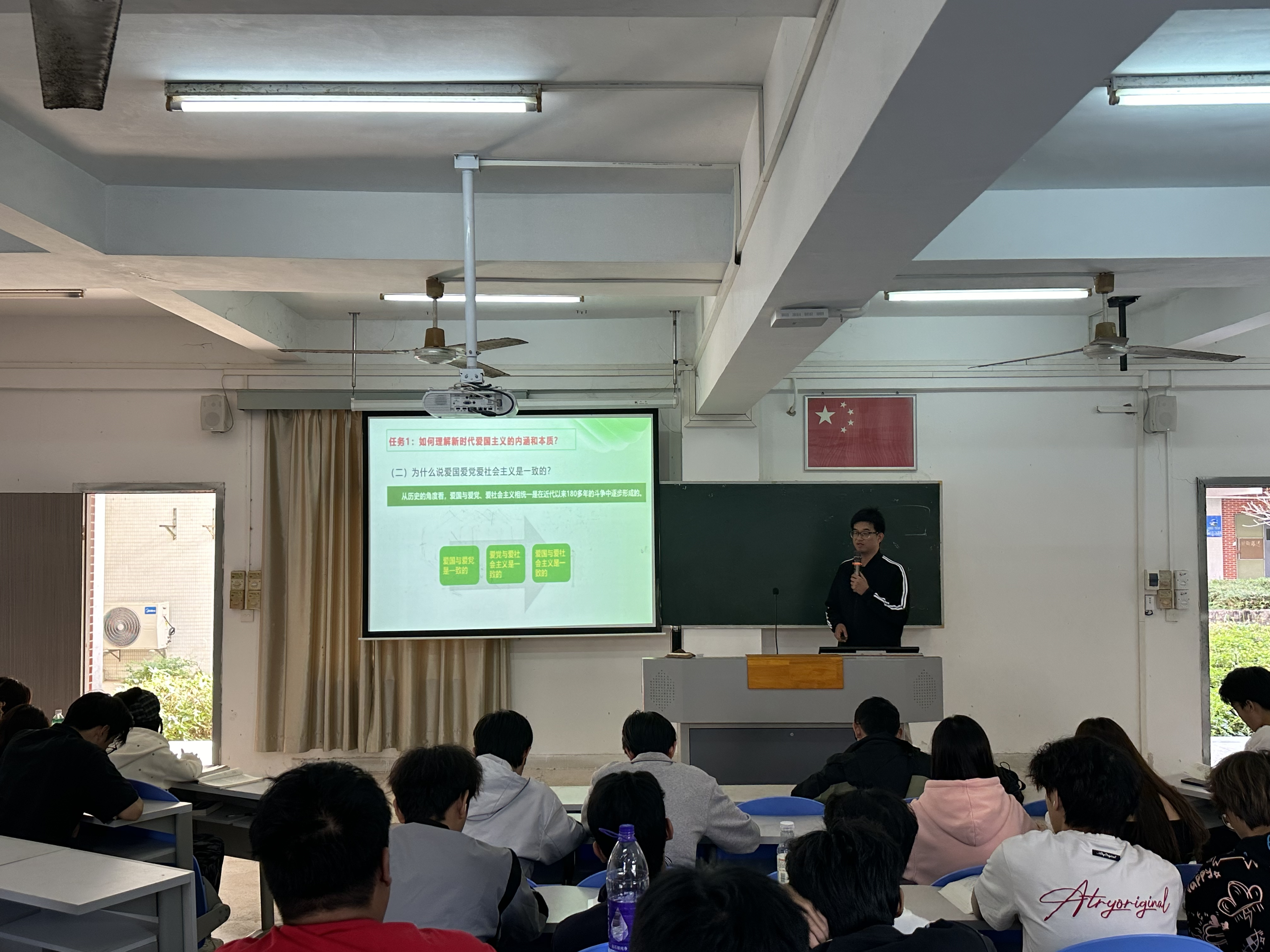 本次教学展示活动由沈育德老师主讲,主题为“做新时代的忠诚爱国者”,授课对象是2024级智能产品开发与应用专业学生。沈老师从无产阶级革命家方志敏笔下的《可爱的中国》一文导入,向学生展示了革命先烈眼中的中国,通过问题式教学法、案例分析法和启发式教学法等教学方式让学生了解爱党爱国爱社会主义相统一的重要性。教学素材多样,案例鲜活生动,有效回应了学生的困惑,课堂气氛活跃,学生学习积极性高。