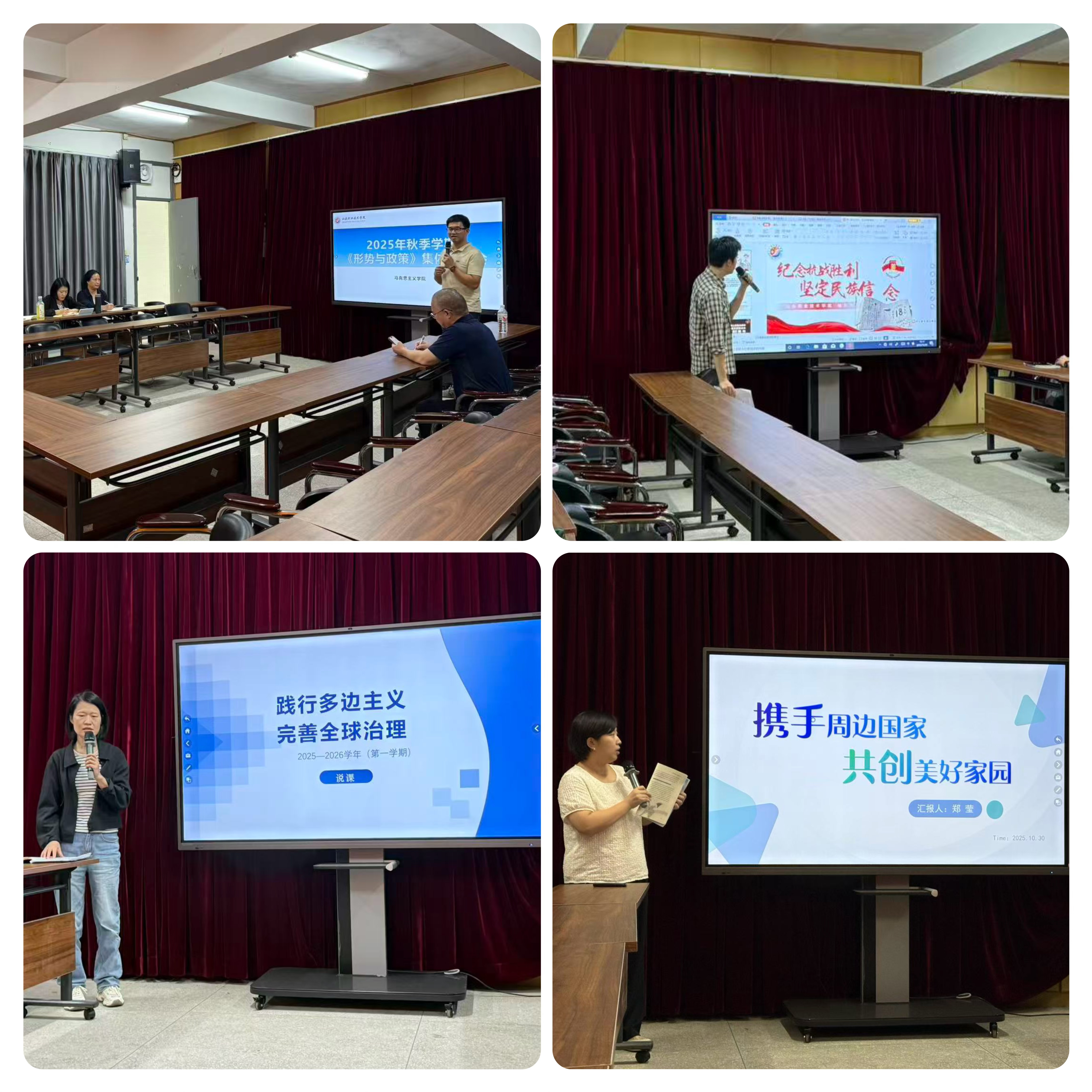 本次备课会以“说课”的形式开展,由沈育德、姚嘉洵、甘慧磊和郑莹等四位老师按专题分工依次围绕《决胜十四五 奋发向前行》《纪念抗战胜利 坚定民族信念》《践行多边主义 完善全球治理》《携手周边国家 共创美好未来》四个专题展示分享备课成果。林院长对老师们的备课情况进行了系统总结,提出针对性指导和建议,着重强调“形势与政策”课各专题教学要注重“问题意识”,既要有思想性、政治性也要突出时效性与动态性。
