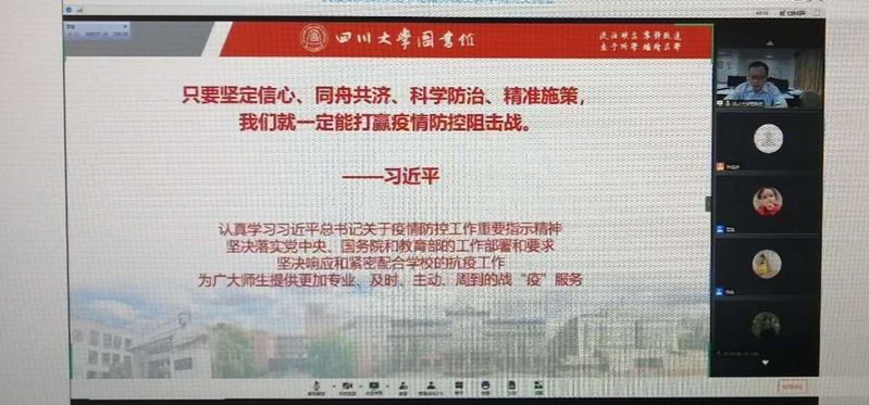 此次业务培训会,图书馆全体人员认真学习聆听来自四川大学图书馆馆长党跃武、西安交通大学图书馆常务副馆长邵晶、上海交通大学图书馆副馆长潘卫、国防科技大学图书馆副馆长施燕斌四位专家长达两个小时的精彩报告,报告围绕疫情期间图书馆积极贯彻教育部“停课不停教、停课不停学”的要求,从技术、资源、服务等方面及时保障师生线上教学需求进行研讨与交流。