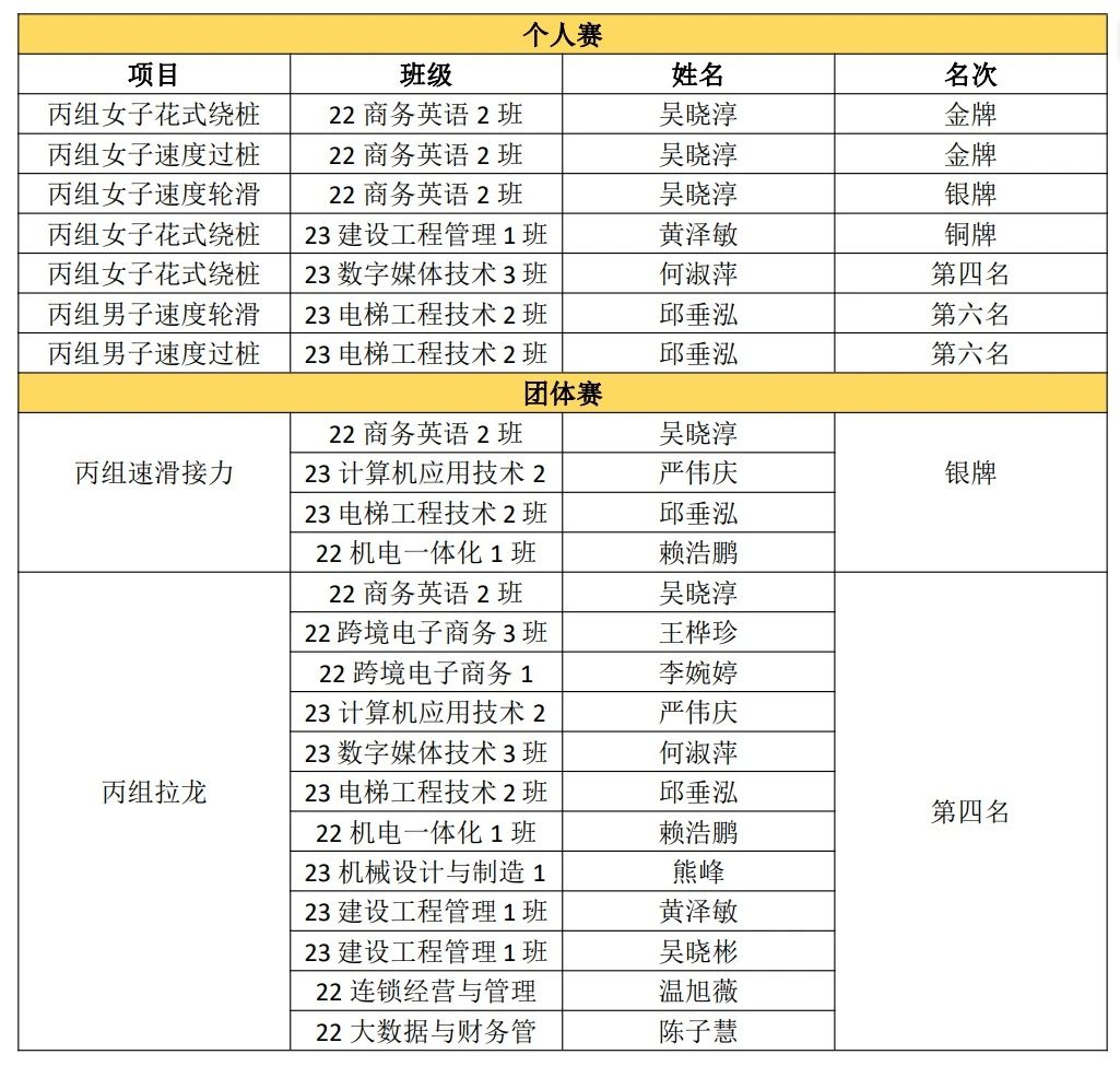 本次比赛,校团委组织轮滑协会参赛,指导老师刘少斌作为教练,12名协会会员组成代表队参加了丙组(大专组)比赛,成功斩获2枚金牌、2枚银牌、1枚铜牌,2个第四名,2个第六名,并获得丙组团体总分第三名的优异成绩,刘少斌老师也获得优秀教练员称号,为学校赢得荣誉。