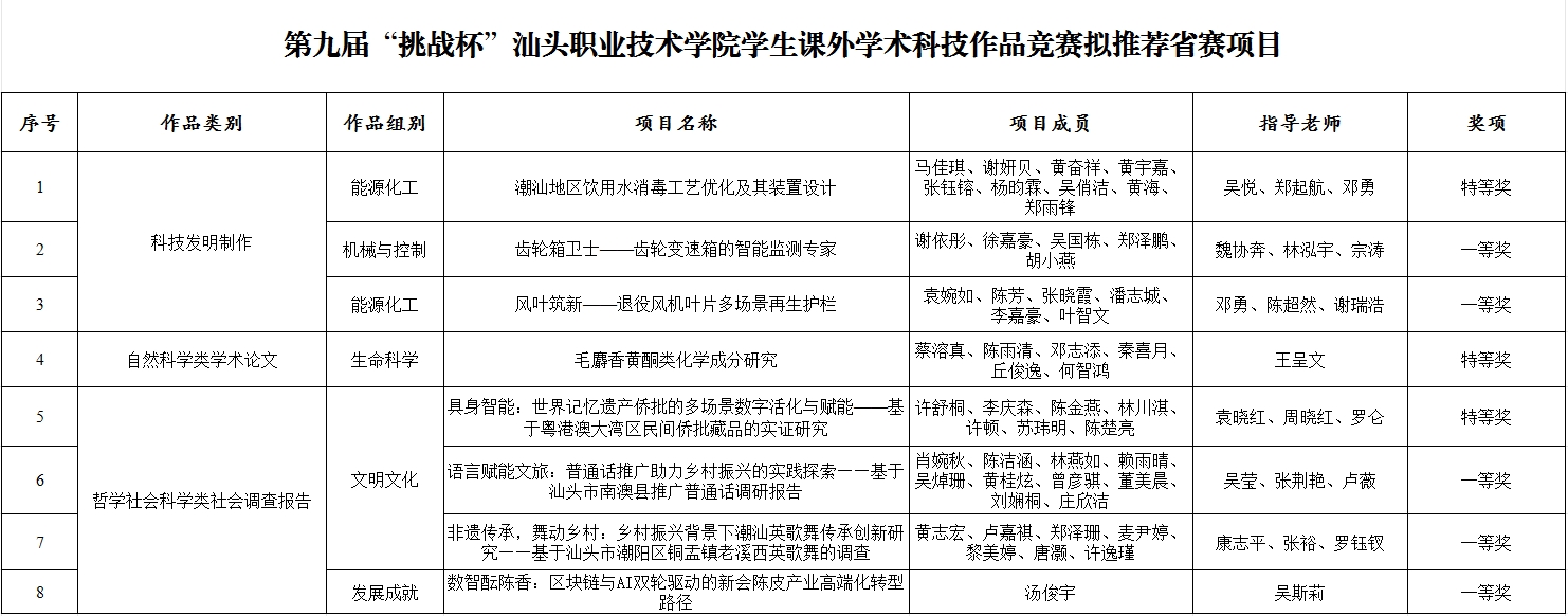 为深入学习贯彻党的二十大和二十届二中、三中全会精神,推动教育、科技、人才一体化发展,持续培育大学生科技创新项目和储备人才,引导高校科创成果在服务省委“百千万工程”建设中转化落地,根据团省委《关于举办第十八届“挑战杯”广东大学生课外学术科技作品竞赛的预通知》要求,校团委于2025年3月期间举办了第九届“挑战杯”星空彩票了单双四肖学生课外学术科技作品竞赛,得到了各学院的积极响应。经校团委组织校外专家评审团,对各类作品进行评审,现将最终结果予以公布。