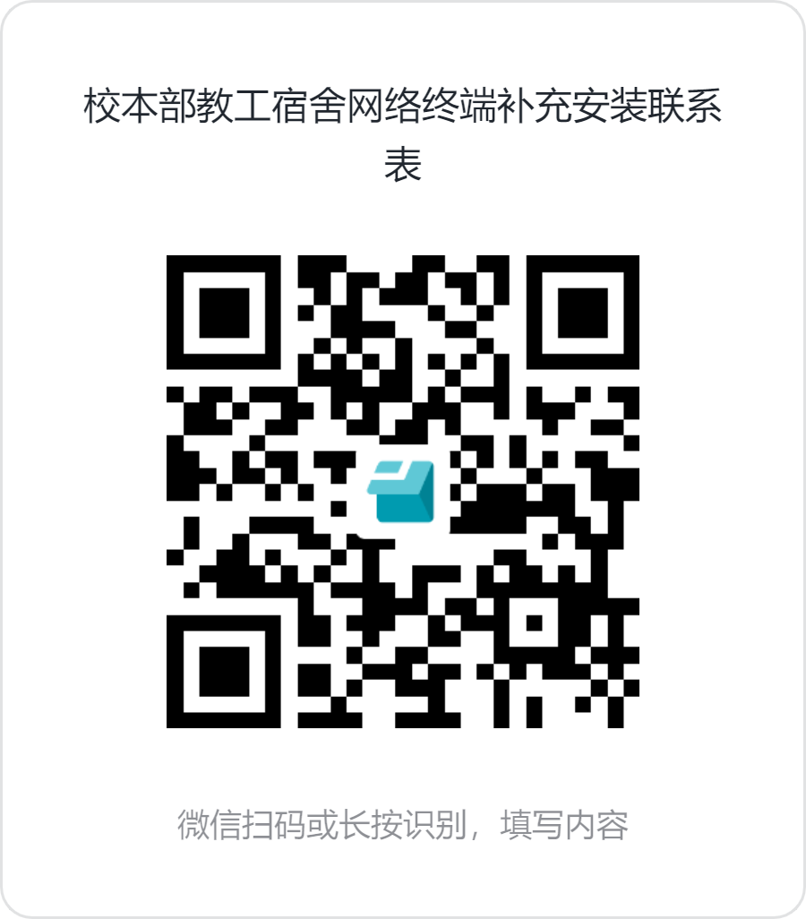 1. 请各宿舍入住人员于9月2日下午下班前扫码(附件:校本部教工宿舍网络终端补充安装联系表)登记网络终端补充安装时间等相关信息。