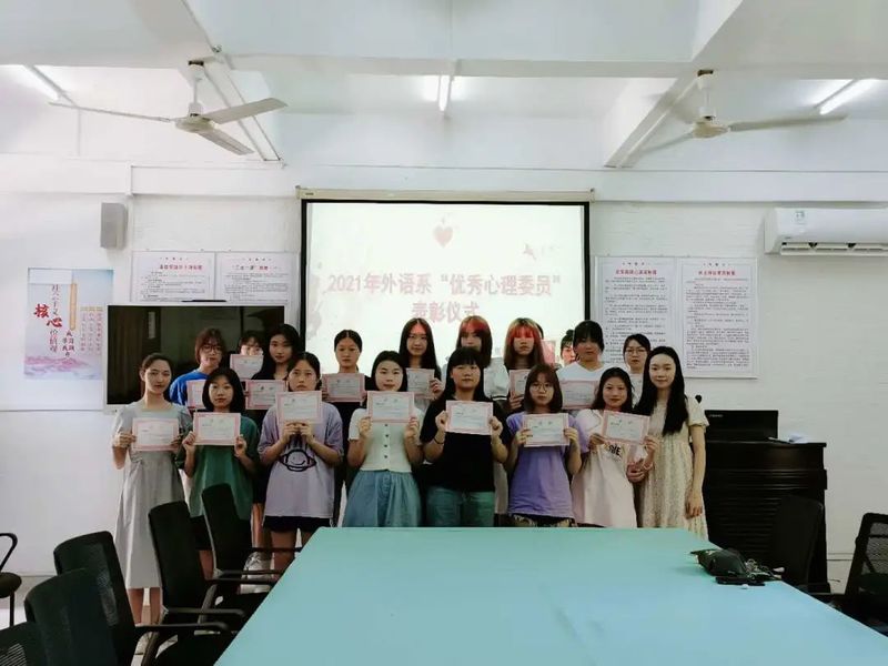 让我们祝贺以上同学!通过此次活动,希望受表彰的同学再接再厉,争取将心理工作做得更加出色。心理委员是构筑好老师与学生之间传递重要信息的桥梁,他们用自己真挚的感情来关怀身边的同学,为全体同学树立了先进典范,同时对我系心理健康教育工作起到了积极的宣传和推进作用。最后,非常感谢外语系团总支学生分会心理部的全体同学对于心理工作的付出跟支持。