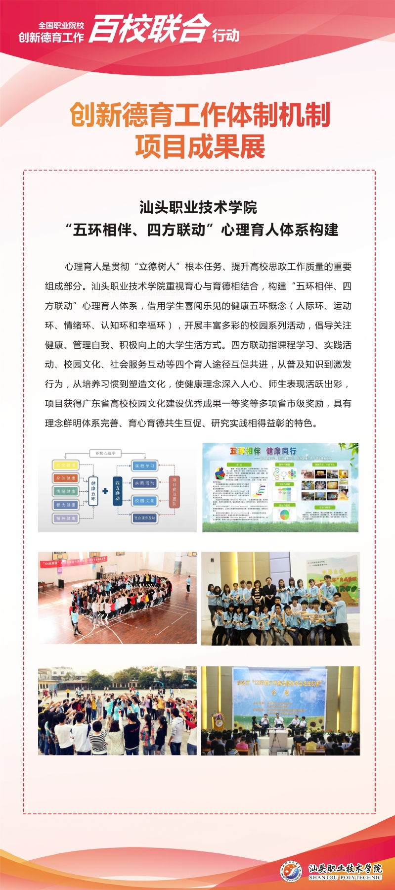 心理育人是贯彻“立德树人”根本任务、提升高校思想政治工作质量与成效的一个重要组成部分。心理与教育教学部重视育心与育德相结合,将学生的健康成长放在首位,重视对学生的人文关怀,基于问题导向,不断探索适应高职学生心理特点的三全育人的有效途径,构建教育教学、实践活动、咨询服务、预防干预、平台保障“五位一体”的心理健康教育工作格局,形成了夯实心育基础与探索特色创新相结合的“五环相伴、四方联动”心理育人体系。