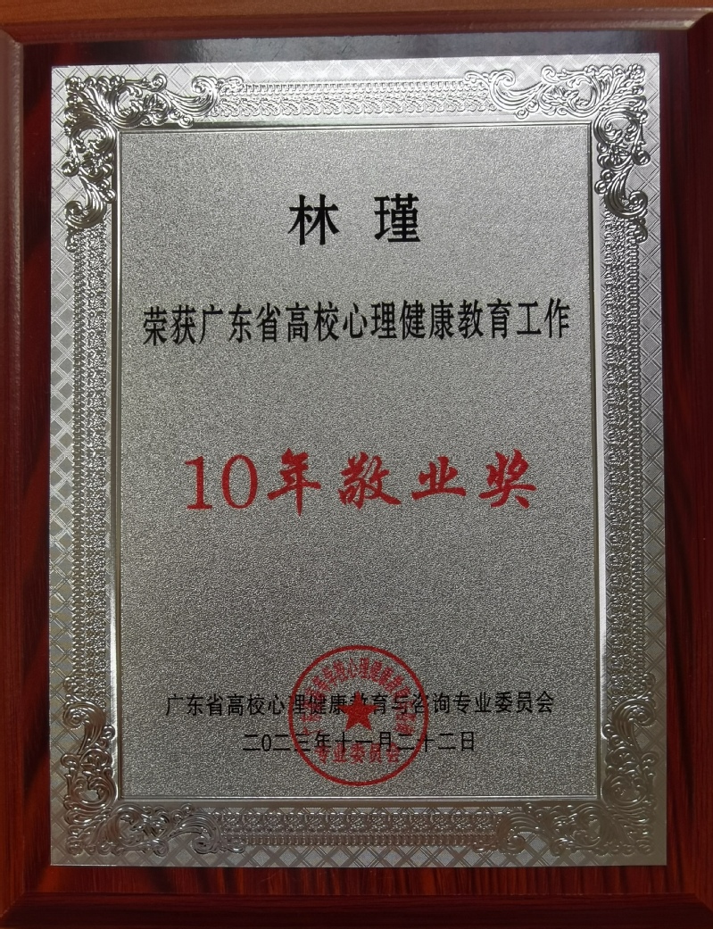 曾锐老师获得“2022-2023年度广东省高校心理健康教育和咨询优秀中心主任”称号,林瑾老师荣获“广东省高校心理健康教育工作10年敬业奖”。此外,我校在心理健康学术专著和论文评比中也获得了不错的成绩。詹丽峰教授、黄彦旎老师主编的教材《大学生积极心理健康教育》荣获“广东省高校心理健康教育与咨询优秀出版物二等奖”;苑玉珍老师、张珣老师学术论文成果分别获得广东省高校心理健康教育与咨询优秀论文三等奖。