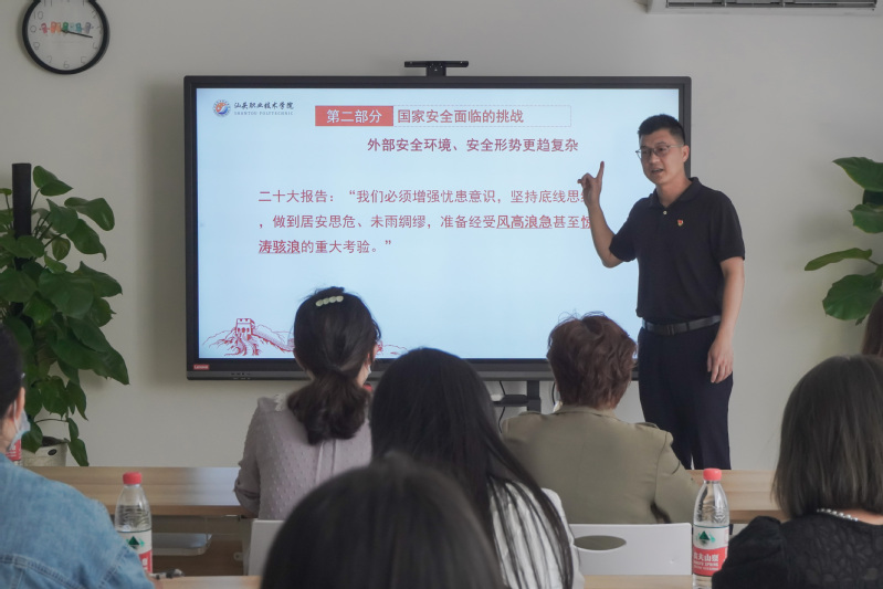 课上,陈部长围绕“国家安全”主题,依次从“党的二十大报告中的‘国家安全’”“国家安全面临的挑战”“立足本职维护国家安全”三个维度进行阐述,内容丰富,案例切题,既有宏观“两个大局”国际国内形势的分析,又有微观个人工作实践的体会,帮助大家提高思想认识,“国家安全是民族复兴的根基,社会稳定是国家强盛的前提”。他强调,辅导员要加强理论学习,不断总结积累经验,做到“因事而化、因时而进、因势而新”,才能更好地教育引导学生、共同维护国家安全。