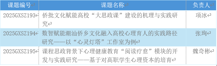 近日,广东省教育厅公布了2025年度广东省高校思想政治教育课题、中小学德育课题立项名单。我校共有3项课题获批立项。其中,文化旅游学院思想政治教育与学生管理科科长张珣主持的课题《数智赋能潮汕侨乡文化融入高校心理育人的实践路径研究——以“心灵灯塔”工作室为例》成功入选立项名单。