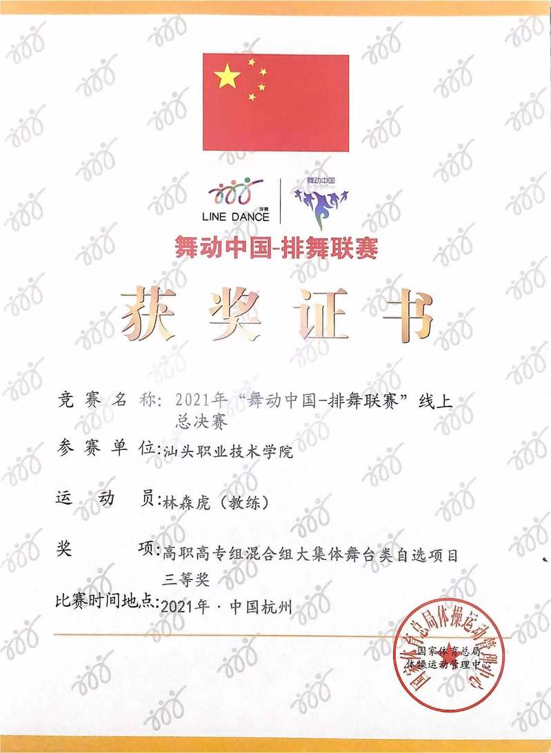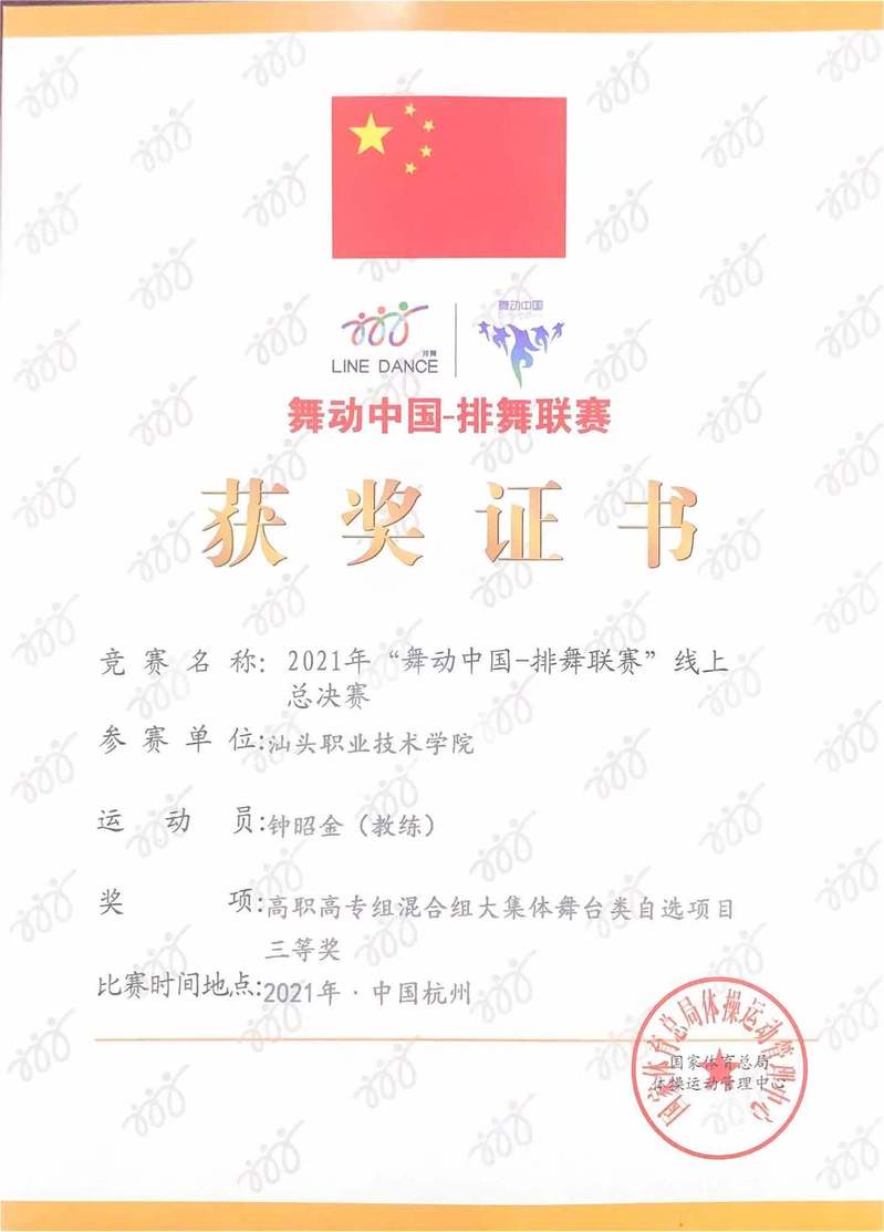 12月20日,由国家体育总局体操运动管理中心、中国蹦床与技巧协会承办的2021年“舞动中国-排舞联赛”线上总决赛,本次赛事来自全国18个省(市、自治区)以及香港和澳门特别行政区,69个城市的338支精英队伍共计5600余人。在此次赛事中我校健美操代表队荣获“高职高专组混合组大集体舞台类自选项目”三等奖。