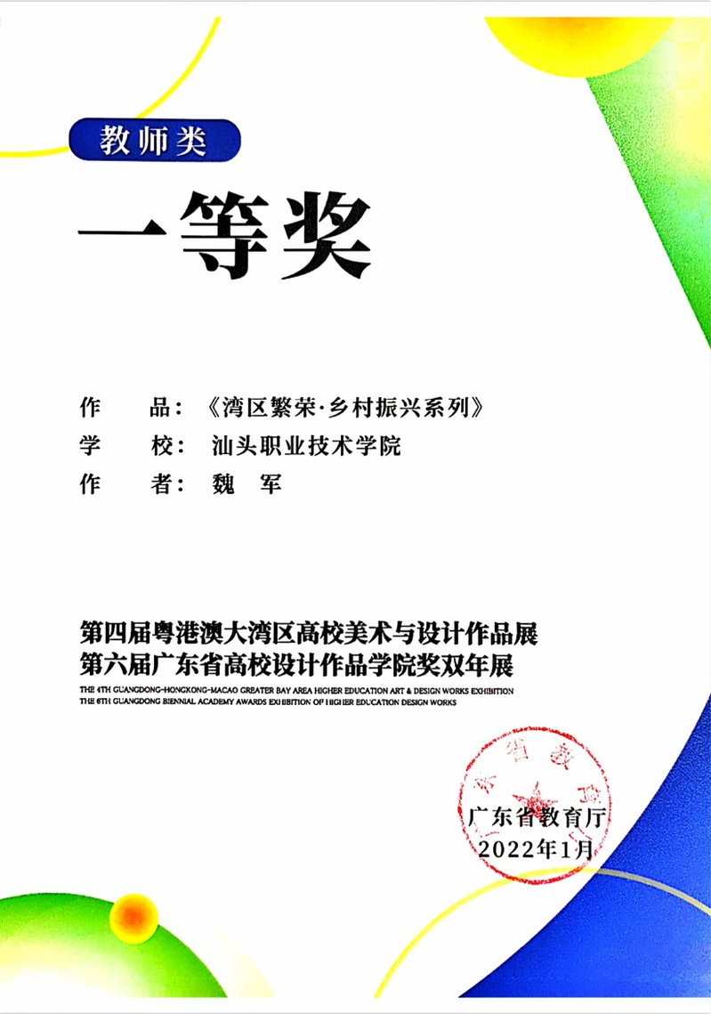 我院在接到省教育厅发文通知以来就积极组织老师进行备赛,经过前期的筹备、送展、参加开幕等相关活动,我系最终共有6名教职工在此次港澳大湾区高校美术与设计作品展暨第六届广东省高校设计作品学院奖双年展中获得优异成绩,在艺术设计、产品设计、服装设计等众多专业中均斩获佳绩,这也体现出了我系专业群建设成效显著,其中魏军老师获得了一等奖的好成绩。