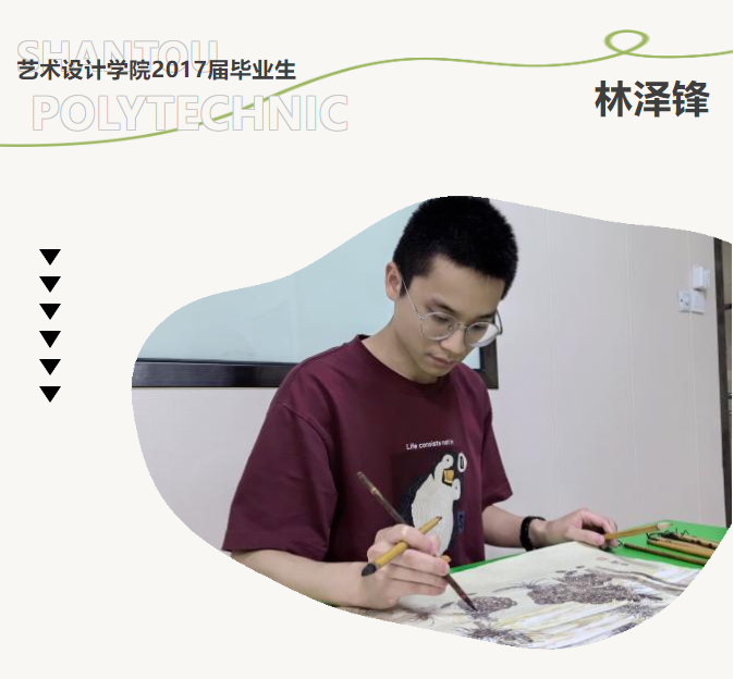 林泽锋是艺术设计学院2017届毕业生,在校期间努力学习专业技能,对绘画有着深厚的热爱,积极参加各种艺术类赛事,曾荣获第五届广东大中专学生书画艺术作品大赛专业国画组二等奖,三等奖等。2017年林泽锋毕业后应聘成为濠江区青少年文体协会的美术辅导员。