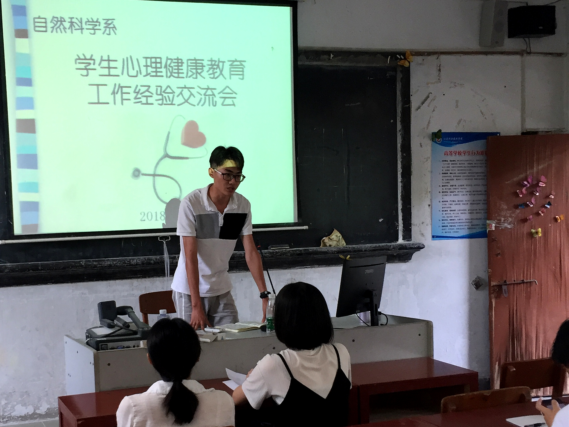 2018年5月24日下午在教学楼203室召开心理健康知识宣讲会和开展心理健康教育工作座谈交流活动。学生科辅导员、各年级各班心理委员、系团总支学生会委员参加活动。活动分两部分,一是由余义坤老师和陈郁蕙老师分别进行心理健康知识宣讲。二是进行心理健康教育工作交流活动,多名参会人员做了主题发言,分享自己在心理健康教育工作方面的心得体会,并对今后学系心理健康教育工作提出建议和意见。交流活动结束后向参加人员发放工作用品。