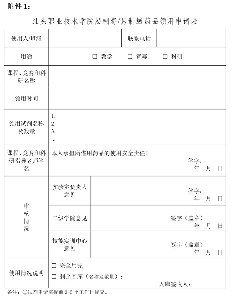 第二条 竞赛、科研实验若需领用,需提前填写《易制毒/易制爆药品领用申请表》并提交实验室负责人、二级学院主要负责人、技能实训中心主要负责人意见,一式两份(一份实验室存档,一份申请人保存),联系相关老师来易制毒/易制爆药品室领取,并妥善保管及合理使用,负责相关安全责任。