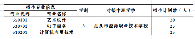 根据《国务院关于深化考试招生制度改革的实施意见》(国发〔2014〕35号)、《教育部等九部门关于印发〈职业教育提质培优行动计划(2020—2023年)〉的通知》(教职成〔2020〕7号)、《广东省人民政府关于深化考试招生制度改革的实施意见》(粤府〔2016〕17号)等文件精神,我院与汕头市澄海职业技术学校联合举办“高职专业学院试点班”,合格毕业生颁发全日制专科毕业证书。
