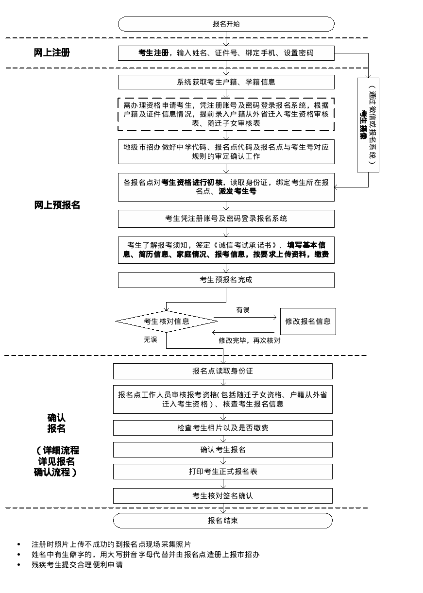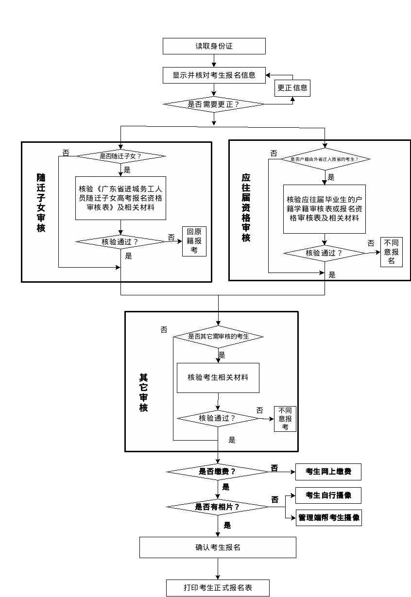 考生档案,包括考生信息(电子档案)和纸质档案,是考生考试、填报志愿、投档录取、入学报到、电子注册、学籍管理、学历证书等相关工作办理的重要依据。考生信息错漏可能导致考生无法正常考试、无法填报志愿、无法在教育部备案毕业时无法获得毕业证书等各种问题。各级招生考试机构要高度重视考生信息数据的采集和建档工作,建立健全考生信息核准检验机制。各报名点、各有关中学要认真指导考生完成报考信息的填写、校对工作,指定专人负责考生信息的核准工作,确保考生信息真实准确。一是要坚持考生基本身份特征信息使用电子设备程序统一采集。统一使用身份证阅读器采集考生基本身份数据,使用省普通高考报名系统、省教育考试院官微小程序采集考生相片和人脸特征信息数据。二是要建立健全考生信息核验机制。对于考生填报的信息有电子数据的要充分利用电子数据核验,无电子数据的要求考生在签名确认前认真逐项检查报名表内容,采用交叉检查、工作人员复核等方式加强人工核验,重点加强对户籍地、应/往届、学籍、选择考科目、联系电话等关键易错信息的核验,确保电子信息数据准确。三是要及时处理报名过程中遗留问题。对报名过程中无法处理的生僻字等问题,报名结束后要按要求及时汇总上报省教育考试院统一备案。考生报名后姓名、证件号、户籍政治面貌等信息有变化,按照“广东省2025年普通高考考生信息修改审核流程”进行更正,信息更正截止时间为2025530日,逾期一律不予办理更改手续。