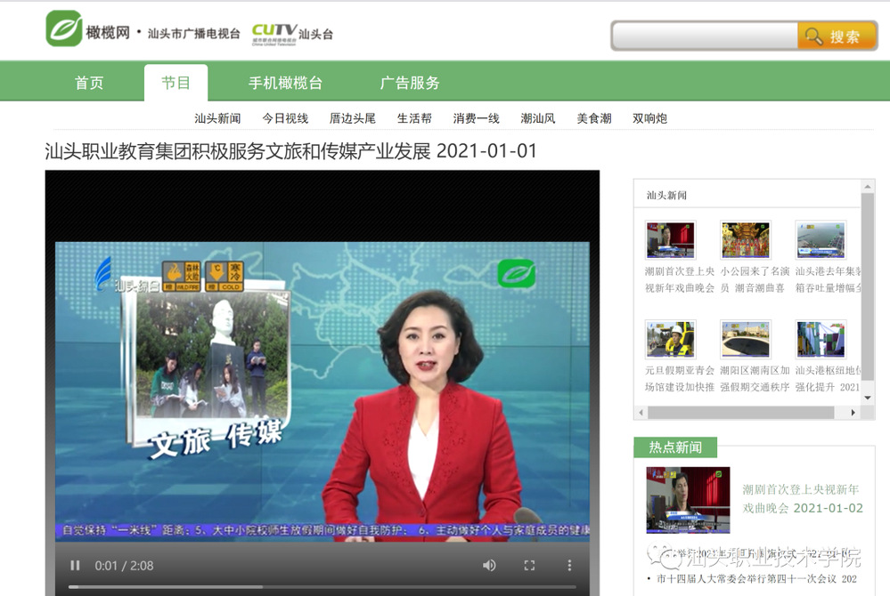 1月1日,《汕头新闻》专题报道了职教集团文化与传媒专业建设指导委员会(下称“文化与传媒专委会”)成立大会,以及人文社科系近几年专业发展和校企合作的工作成果。《汕头日报》和“橄榄台”等本地主要媒体也同步采访。